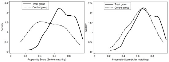 With the help of existing studies [12,48], “distance from the farmer to the county town, topographic condition of the largest plot, distance from the largest plot to the dam, years of education, total business area, and the total number of irrigations” were selected as matching variables in this study. In addition, to ensure the robustness of the regression results, the nearest neighbor matching method, radius matching method, kernel matching, and local linear regression matching methods were used to test the robustness of the PSM model.