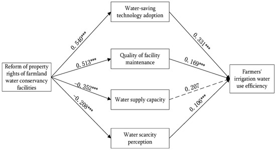 Before analyzing how the property rights reform of farmland water facilities affects the irrigation efficiency of farm households, it is necessary to determine whether the property rights reform of farmland water facilities affects the irrigation efficiency of farm households. Therefore, the first part of this section will use multiple regression analysis to test whether the property rights reform of farmland water facilities affects irrigation efficiency. The second section uses structural equation path analysis to verify the influence mechanism.