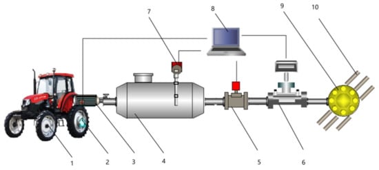 Structure diagram of fertilizer throwing control device: 1: tractor; 2: angular speed sensor; 3: pump; 4: liquid manure storage tank; 5: electric proportional valve; 6: flow meter; 7: liquid level meter; 8: monitoring and control by computer; 9: distributor; 10: sprinkler pipe.