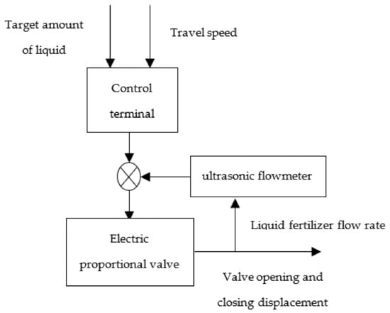 The formation of the manure spreading command equipment is exhibited in Figure 1. During fertilization, the chief command pattern, with the host computer as the main control unit, was used to control the open–shut the solenoid valve (Proportional solenoid valve, Shanghai Kaiweixi Co., Shanghai, China). An angular speed sensor (Analog output, Beijing Tianyuhengchuang Co., Beijing, China) was used to collect the wheel speed and convert it into the vehicle driving speed. The instantaneous flow rate of liquid manure was collected through the flowmeter as input data. The controller output the current signal to the solenoid valve after algorithm conversion. The solenoid valve was used to control valve opening, and the output of the system was the liquid manure flow. Then, the real–time data collected with the fluid meter were coupled back to the regulator, through which the closed–loop negative feedback control was realized.
