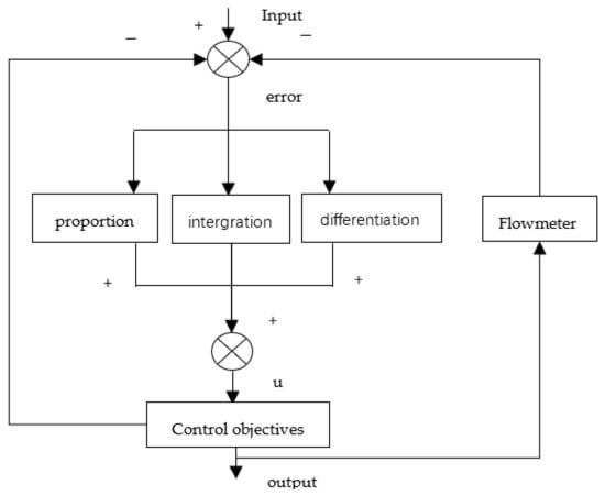 The PID control systematic is a classic control systematic. Figure 4 shows its operating system picture. The difference between the actual output signal of the controlled object and the given signal and tracking is the primary PID control method. The control rate (u) of the proportional (P), integral (I), and differential (D) systems was used as the main index for the analysis of the performance of liquid manure spraying. When the flowmeter feeds back the actual flow to the PID controller, the PID controller first reflects the difference between the actual flow and the demand flow in proportion. The output u (t) is directly proportional to the input deviation e (t), which can quickly reflect the deviation and thus reduce the deviation. Then, the function of the differential link can reflect the change trend (change rate) of the deviation signal, and can introduce an effective early correction signal into the system before the value of the deviation signal becomes too large, in order to speed up the action speed of the system and reduce the adjustment time. Finally, the integration link is used to eliminate the static error and improve the error-free degree of the system. The setting parameters of PID are provided by experience, through which the opening of the electromagnetic proportional regulating valve can be adjusted quickly. Through the feedback value of the flowmeter, the opening of the electromagnetic proportional valve is continuously adjusted to realize the PID control of liquid manure spraying. However, owing to the influence of nonlinearity and time delay in the process of liquid manure spreading, the precision of utilizing the classical PID dominant method to adjust liquid manure spreading is poor. Tracking variations in the application amount cannot be performed well with liquid manure spreading [].