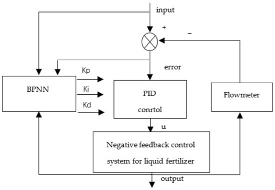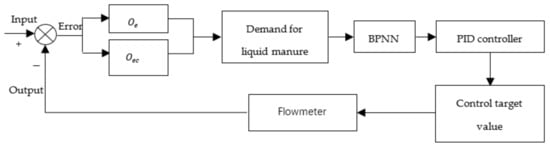 In this study, a BPNN–PID controller was designed according to the control requirements of an alternating–quantity scatter fertility control system for liquid manure. Figure 5 exhibits a flow chart of BPNN–PID control system.
