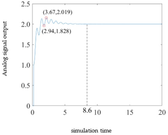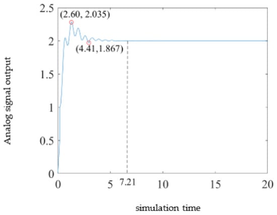 The simulation model of the BPNN–PID dominant system was established in the Simulink simulation module, and the input signal was also a step signal with an amplitude of 2. In the simulation process, the import amplitude step signal with an amplitude of 2 was time t = 0. Simulation time was disabled at 20 s. The input variables of the fuzzy regulator were the error e (k) and error rate of change ec (k) processed by the neural network, and the BPNN-PID regulator output compensation values of PID parameters after calculating KP, KI, and KD through BPNN. Initial parameters were optimized through compensation values, and the control system simulation waveform was obtained.