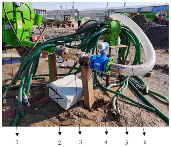 The variable application test of liquid manure was conducted in November 2021 and September 2022 at the test site of Tai’an Yimeite Co. Ltd. The test platform included a self-priming jet pump, monitoring and control via computer, electric proportional valve, flowmeter, distributor, and sprinkler pipe (Figure 16). The max lift of the self-priming jet pump was 15 m, the maximum absorption was 10 m, and the maximum flow was 81 L/min. The controller used the Siemens PLCS7–200 series, and the control software used the force control configuration software. The maximum diameter of the solenoid valve core was 18 mm. The maximum flow under 0.15 MPa pressure was 100 L/min.