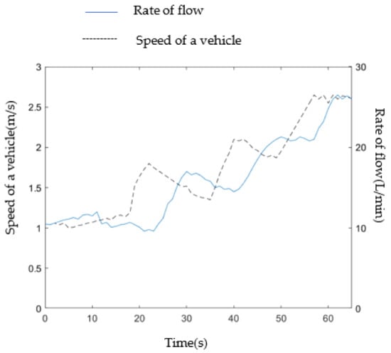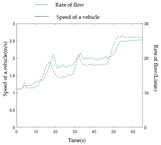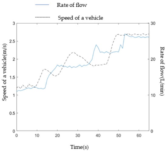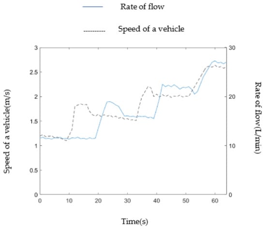 The system output flow was measured at four vehicle speeds. Six measurements were taken for each vehicle speed state. The duration of each measurement was 2 min. The mean value of the six measurements was considered with measurement flow of the velocity. Simultaneously, the absolute and proportional errors of every control system were noted. The experiment outcomes are listed in Table 2.