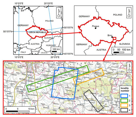 The area of interest is located in South Moravia, SE of Brno, the extent of which corresponds to aerial hyperspectral images taken in 2016, 2017, and 2020 by the Flying Laboratory of Imaging Systems (FLIS) operated by the Global Change Research Institute.