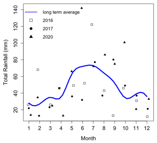 Total rainfall in individual years of processing. The line represents the long-term average for the period from 1981 to 2010.