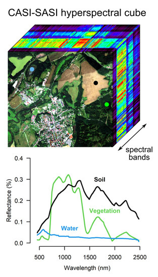 Firstly, all images were radiometrically corrected, georeferenced, corrected for atmospheric influence, and combined into one data cube (185 spectral bands in steps of 371 and 2442 nm, with a bandwidth of 7 nm in the VNIR range and 15 nm in the SWIR range) [23]. Combination into one data cube required (Figure 6) downsampling of the spatial resolution of CASI images to match the nominal spatial resolution of SASI images (5.0 m). Apart from the actual spectral indices, the images were classified in ENVI utilizing the maximum likelihood supervised classification, differentiating between vegetation cover, bare soil, and other forms of land use.
