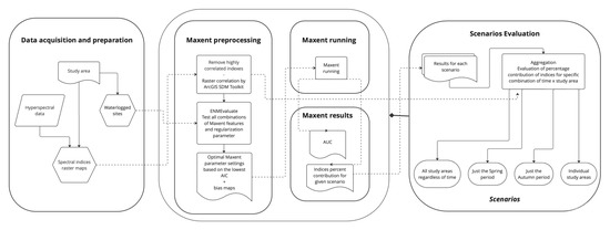 Process flowchart for evaluating analysis deriving raster maps of spectral indices for all the available hyperspectral images. Further selection of uncorrelated variables, testing of parameter settings, running of the Maxent model, and aggregating of all the results.