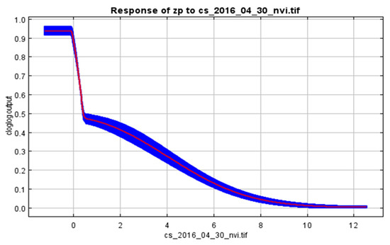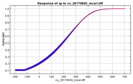 Another output of MAXENT is so-called reaction curves, where we can see the effect of a specific value of the monitored variable on the occurrence probability. The reaction curve of the generally best index (according to the analysis)—NVI—shows a significant decrease in probability with values further away from zero. Therefore, waterlogged surfaces are best determined by values with an index close to 0 (see Figure 8). Another example can be the most successful MCARI index from the autumn of 2017, when its contribution to variability was up to 93% (see Figure 9). The threshold here is represented by values greater than 600.