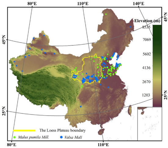 In this study, the occurrence data of apple trees and its plant pathogen (V. mali) in the northern area of the Yangtze River (China) were collected with field surveys, published articles, and online databases (for details see: [17,29]). In total, we collected 260 georeferenced present-only records on apple trees and 211 georeferenced present-only records on V. mali.