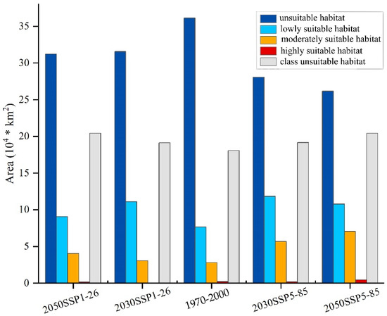 The optimized results showed that, in the 1970–2000 period, the areas of USH, LSH, MSH, HSH, and CUH were 36.15 × 104, 7.66 × 104, 2.80 × 104, 0.23 × 104, and 18.05 × 104 km2, respectively. In the south and southeast of the Loess Plateau, the CUH led to a significant decline in MSH (−5.14 × 104 km2, ~−64.74%) and HSH (−0.63 × 104 km2, ~−74.12%) (Figure 2). Under SSP1-26 and SSP5-85, the inclusion of the CUH resulted in an area decline of the SH in various degrees in the 2030s and the 2050s (Figure 2). In the near future, under SSP1-26, the USH, LSH, MSH, and HSH decreased by 8.75~10.58 × 104, 6.20~7.28 × 104, 3.06~3.40 × 104, and 0.04~0.25 × 104 km2, respectively (Figure 2a,b). In the 2030s and the 2050s, the reduction in the MSH was 50.00% and 45.76%, respectively, whereas it was 50.00% and 59.52% for the HSH. Compared to the MSH and HSH, the LSH was less affected by the CUH, as the proportion of habitat decline in the near future was 39.61% (the 2030s) and 40.68% (the 2050s). Under SSP5-85, the USH, LSH, MSH, and HSH decreased by 8.65~11.07 × 104, 5.73~6.18 × 104 (−34.30%~−34.71%), 3.37~4.11 × 104 (−32.31%~−42.02%) and 0.21~0.26 × 104 km2 (−36.62%~−53.85%), respectively (Figure 2d,e and Figure 3).