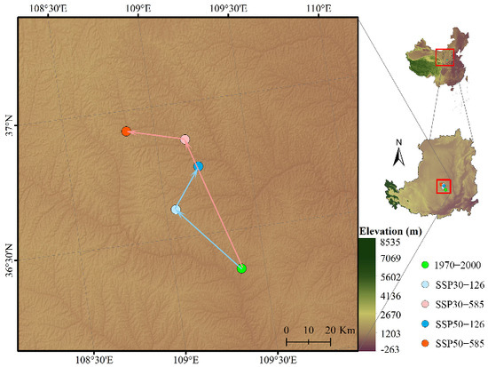 The changes in the distribution patterns of SHs resulted in shifts of their centroids. Currently, the suitability centroid of apple trees is located at 109°22′11.79″ E, 36°21′11.92″ N (Figure 4). Under SSP1-26, the shift distances for the suitability centroid in the 2030s and the 2050s were 40.05 km and 50.32 km, respectively. Under SSP5-85, the shift distances were 63.88 km and 81.30 km, respectively (Figure 4). In particular, we noticed that, under both SSP1-26 and SSP5-85, all suitability centroids of apple trees displaced towards the northwest.