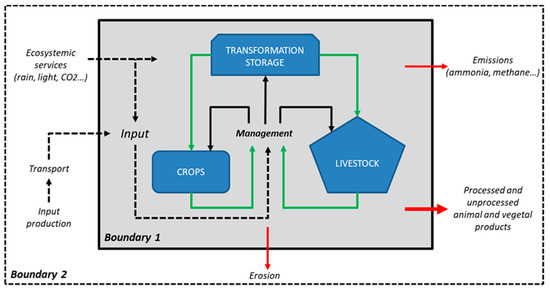 Boundaries of a conceptual farm. The on-farm boundary 1 (solid black line) was used for 16 out of 19 indicators. The off-farm boundary 2 (dotted black line) was used for 3 holistic indicators, i.e., the energy index of renewable flow and the indicators of potential climate impact and GHG emissions. Dotted and solid black arrows refer to flows before and after on-farm management respectively. Green arrows refer to internal flows and red arrows refer to flows leaving the on-farm boundary 1.
