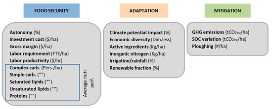The first step was to define the three CSA pillars and their attributes. The three classical dimensions, economic, social and environmental [32], were taken into account for the definition of these three pillars. During successive workshops and oral presentations between researchers/technicians, farmers and decision-makers, the indicators covering those three dimensions were selected to describe the outcomes with regard to the three pillars of CSA. The selection should respond to the four main characteristics of a good indicator, with a reduction in the number of indicators when (1) the indicators are redundant (one can be estimated from the other) and (2) they are not generic enough for comparison between farms from contrasting contexts. We followed a holistic understanding of the farms in order to obtain as small a set of indicators as possible. To obtain indicators that were as generic as possible, we took into account the regional context when relevant, e.g., for the indicator “Irrigation/rainfall”, we weighted the annual farm water requirements by the annual volume of rainwater intercepted by the farm area. Figure 2 is a synthesis of the indicators of each pillar used in this study and for CSA assessment at the farm scale.
