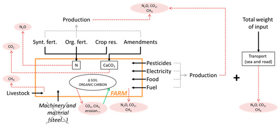 Description of the gas flows that were taken into account for estimating greenhouse gas emissions (“GHG emissions”) of the farm represented with the orange line. Black, green and red dotted arrows refer to inputs, gas emissions and CO2 sequestration respectively. Synt. Fert., Org. fert. and Crop res. refer to Organic fertilizers, Synthetic fertilizers and Crop residues respectively. The variation (∆) of soil organic carbon was accounted for separately with the indicator “SOC variation”. Emissions related to machinery and other materials (crossed out in gray) were not taken into account.