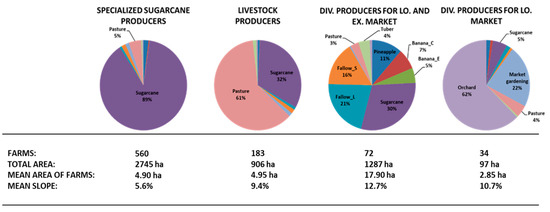 To determine to what extent the study region met the objective of CSA, the diversity of existing farming systems was first characterized with a farm typology. Crop rotations represent the outputs of farmers’ decisions based on their objectives, constraints and biophysical context. To build the farming system typology, data were used on crop acreages, slopes and farm size, which are easily available worldwide based on surveys or databases, such as the IACS for the European Union [28]. In this study, the 2010 governmental farmers’ declaration data of areas and crop rotations of the farming system (methodology described in Todoroff et al. [29]) was used as input data to build up a typology, which represented approximately 80% of the agricultural fields of the archipelago. According to those data, the region comprised 849 farms representing 5035 ha (i.e., 18% of the whole archipelago’s agricultural land area). The typology was obtained following the method detailed in Chopin et al. [30], combined with principal component analysis of the proportion of crops in farm areas with a hierarchical ascending clustering on the resulting principal components to obtain four groups of farms. For each of the four types of farms established from the typology obtained, three farms were randomly selected and surveyed (stratified sampling). To scale up, the assessment results were extrapolated to the whole farming system of the study region using the share (in terms of acreage) of each group.