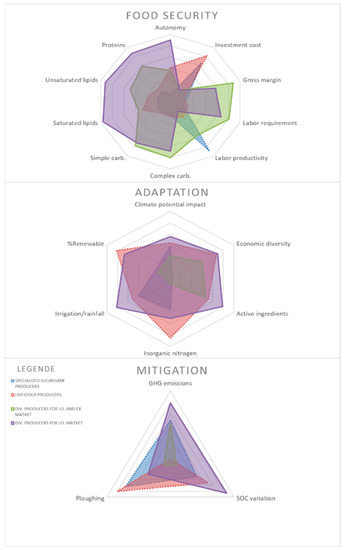 These indicators are measures of the ratio between the annual macronutrient production of the farm and the average daily reference intakes. They may be the most important indicator of food security because they are directly related to food production efficiency, which is the first issue to address in a fast-growing world population. Moreover, sustainable or agroecological management can be more context-dependent, making yield gaps an important issue regarding their ability to feed people [43,44]. In this study, we considered an average 2800 kcal·day−1 with 7.5% from saturated lipids, 15% from unsaturated lipids, 10% from simple carbohydrates, 55% from complex carbohydrates and 12.5% from proteins [45,46]. Finally, this indicator addresses the issue related to the reduction in production diversity (linked to malnutrition) that can accompany policies of agricultural intensification [47].