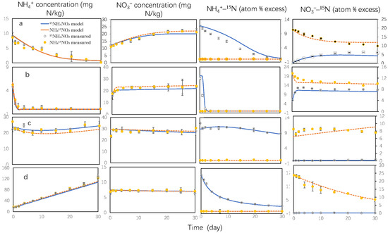 Figure 1. Measured and modeled concentrations of NH4+, NO3, and their 15N enrichment in black soil (a), fluvo-aquic soil (b), upland red soil (c), and paddy red soil (d) under aerobic incubation conditions.