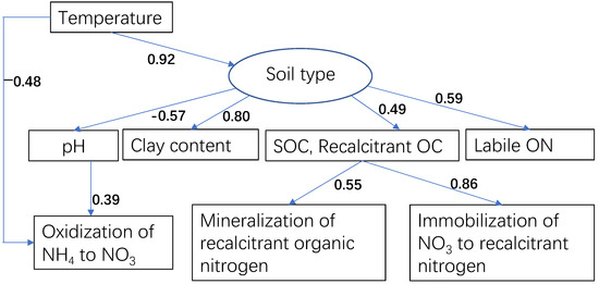 The PLS-PM results showed that gross N transformation rates varied significantly due to changes in temperature, soil pH and SOC contents (including SOC and recalcitrant OC). Labile N and clay content were key reflective indicators for soil type, although they had no significant impacts on gross N dynamics. Mineralization of recalcitrant organic nitrogen (MNrec) was regulated by SOC (0.55). Nitrification (ONH4) of NH4+ was regulated by temperature (−0.48) and pH (0.39). Nitrate immobilization was regulated by SOC (0.86). The prediction power (GoF, Goodness of Fit) of the structural model for the correlations was higher than 0. 74 (>0.7 is considered to be very good).