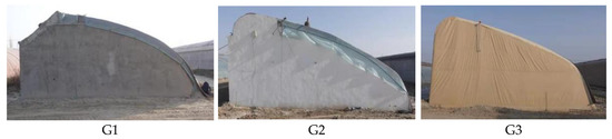 G1 is a south-facing brick construction, with a north-south span of 9 m, an east and west length of 75 m each, a height of 4 m, a north wall height of 2.5 m, and a thickness of 60 cm. G2 is a south-facing construction. The north-south span is 10 m, the east-west span is 72 m, the ridge height is 5.2 m, and the height for the north wall is 4 m. Brick and benzene board constitute the north wall, which is 50 cm thick (20 cm bricks, 10 cm benzene boards, and 20 cm bricks). G3 is made up of galvanized steel pipes and polyester wadding, and is south-facing; the north-south span is 12 m, the east-west span is 72 m, its height is 5.2 m, and its north wall’s height is 4 m (Figure 3).