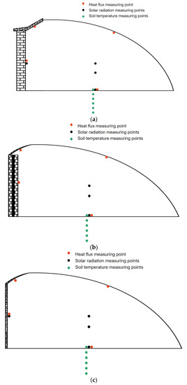 The PDE-RI temperature data recorder (Harbin Wage Electronic Technology Co., Ltd., Heilongjiang, China, temperature measuring range: 20–60 °C, accuracy: 0.5 °C, resolution: 0.1 °C) was used to record the data on air temperature, humidity, and soil temperature. The PDE-RI environmental data recorder (measurement range: 0–2000 W/m2, accuracy 3%, resolution 1 W/m2) was used to capture the solar radiation. Use TNRL-20 soil heat flux sensor (sensitivity coefficient: 23.26 W/m2) to measure the heat flow through the enclosure construction (The Jinzhou Tiannuo Environmental Instrument Co., Ltd., Liaoning, China) [22].