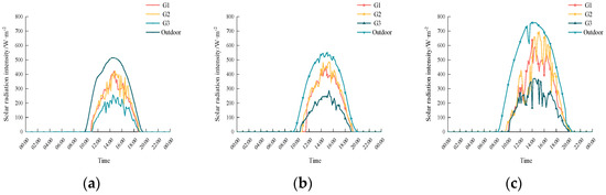 We screened out the typical sunny days each month (Figure 5). On January 28, the daytime average solar radiation of G1 was an average of 242 W/m2, G2 was 247.1 W/m2, and G3 was 146.4 W/m2; on February 20, it was 281.8 W/m2 for G1, 290 W/m2 for G2, and 159.2 W/m2 for G3; On March 31, it was 308.3, 316.8 W/m2, and 204.7 W/m2 for G1, G2, and G3, respectively. According to the results, G3 received the least amount of solar energy, and G1 and G2 barely differed.