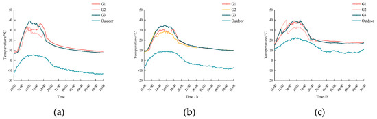 Temperature variation of CSGs on typical sunny days from January to March. (a) 28 January 2022. (b) 20 February 2022. (c) 31 March 2022.