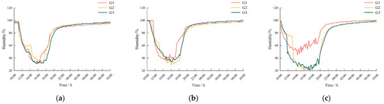 Humidity variation of CSGs on typical sunny days from January to March. (a) 28 January 2022. (b) 20 February 2022. (c) 31 March 2022.