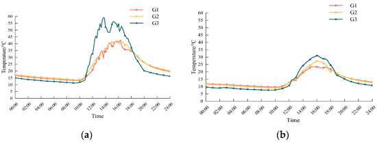 Wall surface temperature variation of CSGs under typical weather. (a) Sunny day (20 February 2022). (b) Cloudy day (18 February 2022).