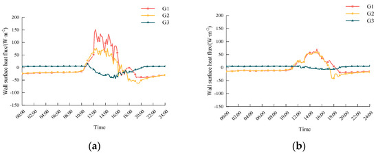 Changes in heat flux on the wall surface of CSGs under typical weather. (a) Sunny day (20 February 2022). (b) Cloudy day (18 February 2022).