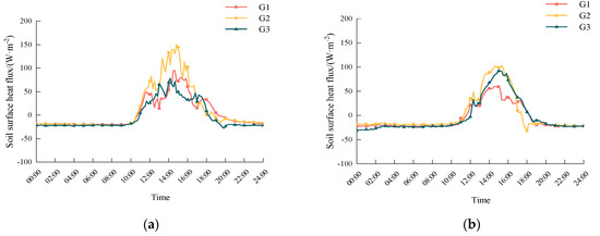 Variation of soil surface heat flux in typical weather in CSGs. (a) Sunny day (20 February 2022). (b) Cloudy day (18 February 2022).
