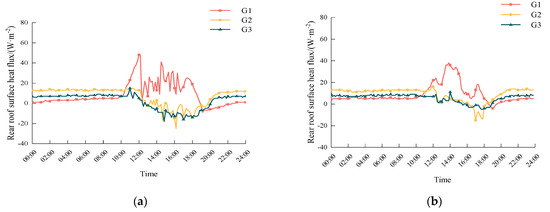 Heat flow change in the north roof of CSGs under typical weather. (a) Sunny day (20 February 2022). (b) Cloudy day (18 February 2022).