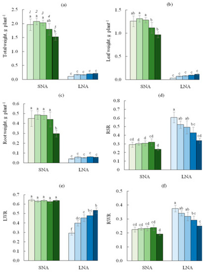 Total (a), leaf (b), root (c) weight, root shoot ratio (RSR, (d)), leaf weight ratio (LWR, (e)), root weight ratio (RWR, (f)), for cucumber seedlings grown on the sandy loam soil with a sodium lignosulfonate concentration of 0 (1), 1 (2), 2.5 (3), 5 (4), and 10 (5) vol % under sufficient nutrient availability (SNA) or low nutrient availability (LNA). Significant differences at p < 0.05 indicated with different letters.