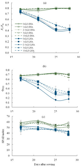 Temporal dynamics of the maximal quantum yield of PSII photochemistry ((a), Fv/Fm), actual quantum yield of PSII photochemistry ((b), ϕPSII) and SPAD index (c) for cucumber seedlings grown on the sandy loam soil with a sodium lignosulfonate concentration of 0 (0sLS), 1 (1sLS), 2.5 (2.5sLS), 5 (5sLS), and 10 (10sLS) vol % under sufficient nutrient availability (SNA) or low nutrient availability (LNA).