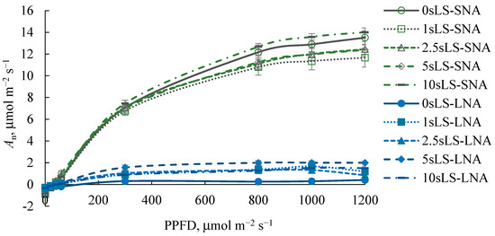 Light response curves of leaf CO2 gas exchange of cucumber seedlings grown on the sandy loam soil with a sodium lignosulfonate concentration of 0 (0sLS), 1 (1sLS), 2.5 (2.5sLS), 5 (5sLS), and 10 (10sLS) vol % under sufficient nutrient availability (SNA) or low nutrient availability (LNA).