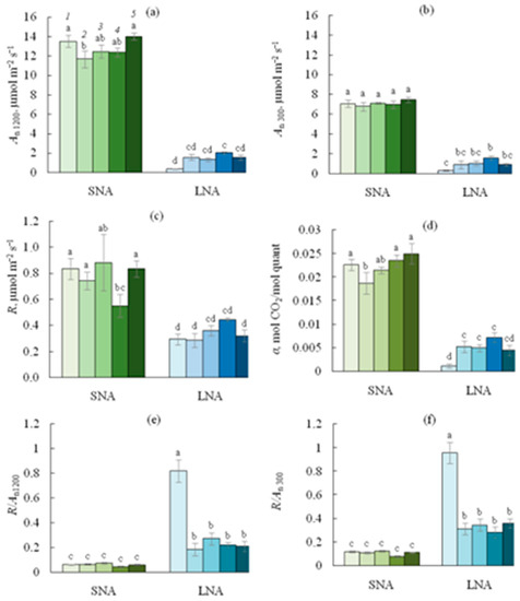Net CO2 assimilation rate at 1200 ((a), An1200) or 300 ((b), An300) PPFD, leaf respiration ((c), R), apparent quantum yield of photosynthesis ((d), α), R/An ratio at 1200 ((e), R/An1200) or 300 ((f), R/An300) PPFD for cucumber seedlings grown on the sandy loam soil with a sodium lignosulfonate concentration of 0 (1), 1 (2), 2.5 (3), 5 (4), and 10 (5) vol % under sufficient nutrient availability (SNA) or low nutrient availability (LNA). Significant differences at p < 0.05 indicated with different letters.