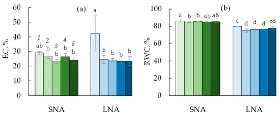 Electrolyte leakage (EC, (a)) and relative water content (RWC, (b)) in leaves of cucumber seedlings grown on the sandy loam soil with a sodium lignosulfonate concentration of 0 (1), 1 (2), 2.5 (3), 5 (4), and 10 (5) vol % under sufficient nutrient availability (SNA) or low nutrient availability (LNA). Significant differences at p < 0.05 indicated with different letters.