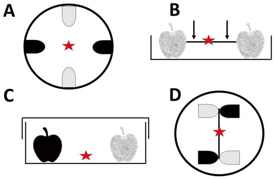 Schematic representation of experimental designs used in studies on preventing apple infestation by codling moth neonates with plant-derived materials. (A) Design of Suomi et al. [15]. Two control apple plugs (gray) and two test apple plugs (black) were placed in a Petri dish at each 90° interval with test and control plugs alternating. (B) Design of Landolt et al. [16]. A glass rod was imbedded at each end into untreated thinning apples (gray). Tested plant essential oils were applied to the glass rod creating barriers at 2 cm from each apple (arrows). (C) Design of Kovanci [17]. Two thinning apples, one test (black) and one control (gray), were placed in a glass dish and presented to codling moth neonates in a choice assay. (D) Design used in the laboratory of the author [19,20,21,22,23]. Apple plugs are arranged in pairs consisting of one test plug (black) and one control plug (gray) and connected with a glass rod, providing choice of feeding substrate for codling moth neonates. Red asterisks show the place where the neonates were released at the beginning of the tests. Remaining details are given in the text.