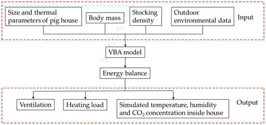 Energy balance equations were used to build a VBA model that could simulate the ventilation and environment of pig houses in winter under different breeding conditions. The simulation process is shown in Figure 1. To ensure the model could produce precise results, the model was verified first; the validation of the calculation model is presented in Section 3.1.