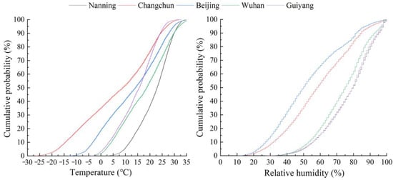 The meteorological data used in the simulation were derived from Meteonorm 7, which could obtain the annual weather data of each place with an hour as a node. The obtained data (temperature and relative humidity of the five cities) were plotted as a cumulative probability graph, as shown in Figure 2. The graph showed that the lowest temperatures in Changchun, Beijing, Wuhan, Nanning, and Guiyang were −26.7 °C, −13.4 °C, −4.1 °C, 2.1 °C, and −4.2 °C, respectively. The annual temperature difference in Changchun is large, while the annual temperature in Guiyang is relatively moderate, without extreme high and low temperatures. The relative humidity and temperature have basically the same trend, that is, the relative humidity is lower when the temperature is lower. However, the relative humidity in Beijing is lower and in Guiyang and Nanning is higher, which may be related to the location and local geography. In summary, Changchun and Beijing are cold and dry, while Nanning is warm and wet in winter. Therefore, heating in nursery and fattening pig houses in Changchun is relatively important, and the building should apply higher thermal resistance. There were no sub-zero temperatures in Nanning in winter, so the heating demand was lower.