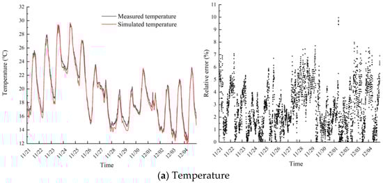 Through comparison, it was found that the maximum absolute error of the simulated temperature is 1.9 °C, the average absolute error is 0.5 °C, the maximum relative error is 9.9%, and the average relative error is 2.8%. The simulation accuracy of the VBA model for the temperature of the experimental house is similar. The relative errors between the simulated temperature and the measured value is within 5%.