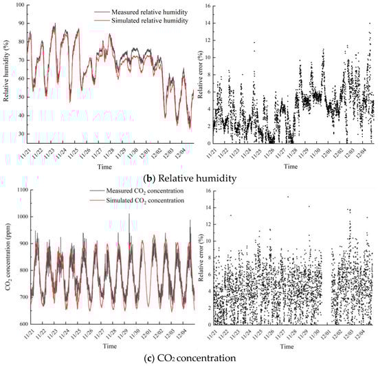 Due to a power outage caused by the improper operation of on-site workers during the experiment, we excluded the short-term untested data time point related to the power outage of the sensor. Through comparison, it can be seen that the maximum absolute error between the simulated CO2 value and the measured value is 144.2 ppm, the average absolute error is 30.6 ppm, the maximum relative error is 15.2%, and the average relative error is 4.2%. The change of CO2 concentration in the house has the same change trend as the forecast model. However, the CO2 concentration in the house is greatly affected by the amount of animal activity, so the measured value has a large variation amplitude and a large relative error.