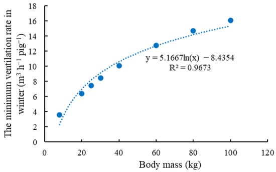 In this research, a regression analysis of pig body masses and the corresponding theoretical winter minimum ventilation rate was conducted under a comprehensive consideration of the temperature conditions, relative humidity conditions, and CO2 concentrations in the house. The winter minimum ventilation rate was established as shown in Equation (14).