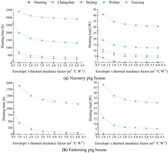 Figure 6b shows the heating situation in the fattening pig houses in different cities. It could be clearly observed that the winter heating demand of the fattening pig houses was much lower than that of the nursery pig houses. The reason might be that the fattening pigs produced a large amount of heat. With the increase of the thermal insulance factor of the building envelope, the change trends of the heating time and heating load are the same as those shown in Figure 6a. Therefore, the thermal insulance factor in Changchun and Beijing should not be greater than 3 and 2 m2 °C W−1, respectively. When the thermal insulance factor was 0.5 m2 °C W−1, the heating time in Wuhan and Guiyang were 81 and 162 h, respectively. Therefore, when selecting the thermal insulance factor of the fattening pig house, Wuhan, Guiyang, and Nanning should not exceed 0.5 m2 °C W−1. This provided a reference for the selection of the thermal insulance factor, which was the most economical value to use, in different types of pig houses in different regions.