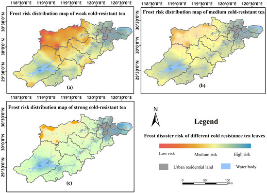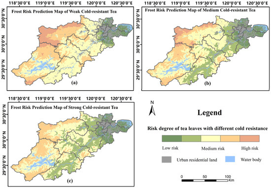 Frost disaster risk map of tea with different cold resistance: (a) Prediction of freezing injury risk of tea with weak cold resistance; (b) Prediction of risk of freezing injury of tea with moderate cold resistance; (c) Prediction of risk of freezing injury of tea with strong cold resistance.