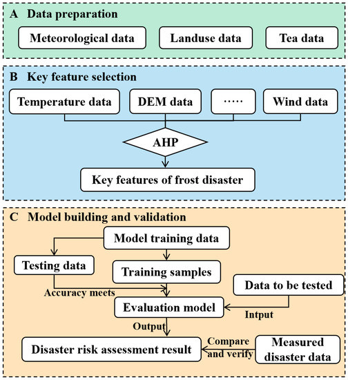 The flow chart of the technical approach in this paper is shown in Figure 3. It includes data preparation, key feature selection, and random forest model building and validation. Data preparation includes acquiring and processing meteorological, terrain, land use, and tea-related data. The key feature selection is to select six kinds of data that may cause disasters according to the principle of tea frost and obtain the most important feature data through the AHP method. Model building and verification use the random forest algorithm to divide, sample, verify, and test the data to obtain the evaluation model of this study, and then input the data to be tested to obtain the tea disaster risk assessment results. The evaluation results are compared, verified, and analyzed through the measured disasters in the Disaster Statistical Yearbook.