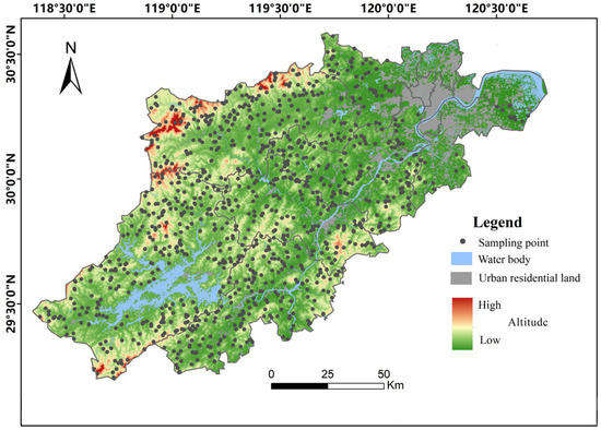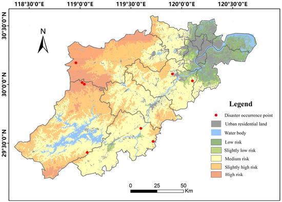 According to the hazard annual report data in the basic database of hazard prevention and reduction in Hangzhou, the locations of the actual tea frost hazards are all in areas with high-risk levels (Figure 4), which proves that it has high reliability and can be used as a source for model sample selection. In Hangzhou water bodies and other areas outside urban residential land, 1000 sample point data points were evenly selected, and the specific spatial distribution is shown in Figure 5 below.