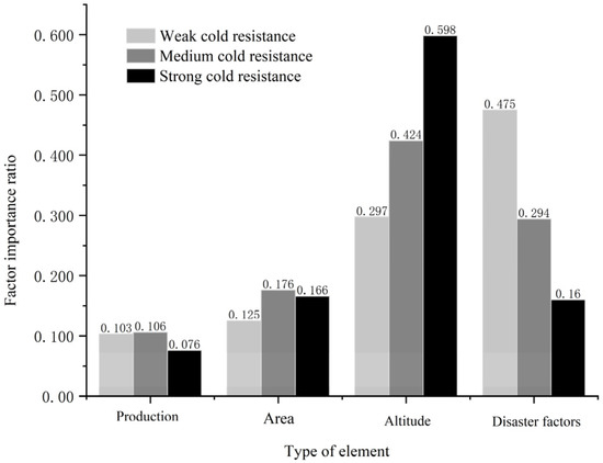 From the perspective of different types of cold-resistant tea, the most important indicator of weak cold-resistant tea is altitude. The most important indicator of medium and strong cold-resistant tea is the hazard-causing factor composed of low-temperature data. Due to the weak cold resistance and temperature drop rate of tea with weak cold resistance, altitude is the main factor for the risk of frost hazards, while tea with medium cold resistance and strong cold resistance have strong cold resistance. To overcome the influence of altitude, the main influencing factor is the hazard data composed of the lowest temperature. Overall, hazard-causing factors and altitude data are the most important contributing indicators. The sum of the two is close to 70%, indicating that it contributes the most to the risk assessment results. The influence of altitude and hazard-causing factors should be considered when planting tea trees.