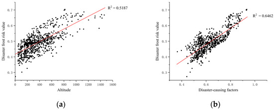 Correlation between frost disaster risk value and different factors: (a) Frost hazard risk value and altitude correlation; (b) The correlation between frost disaster risk value and disaster-causing factors.